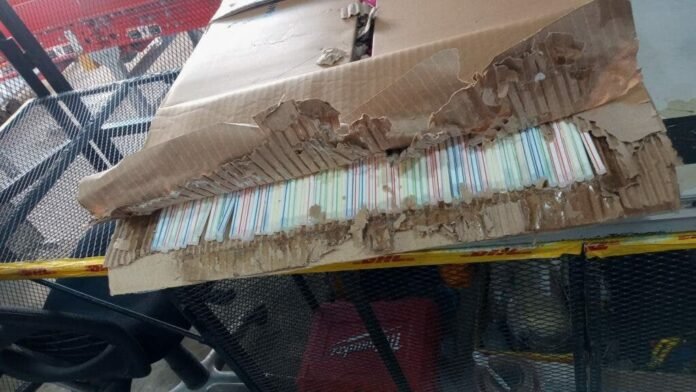 Cuando se abrió el paquete, se descubrió un fondo doble en la parte inferior de la caja y entre las ranuras de las tapas, con un total de 110 pañuelos cargados de cocaína, con un peso cercano a los 300 gramos de la misma.